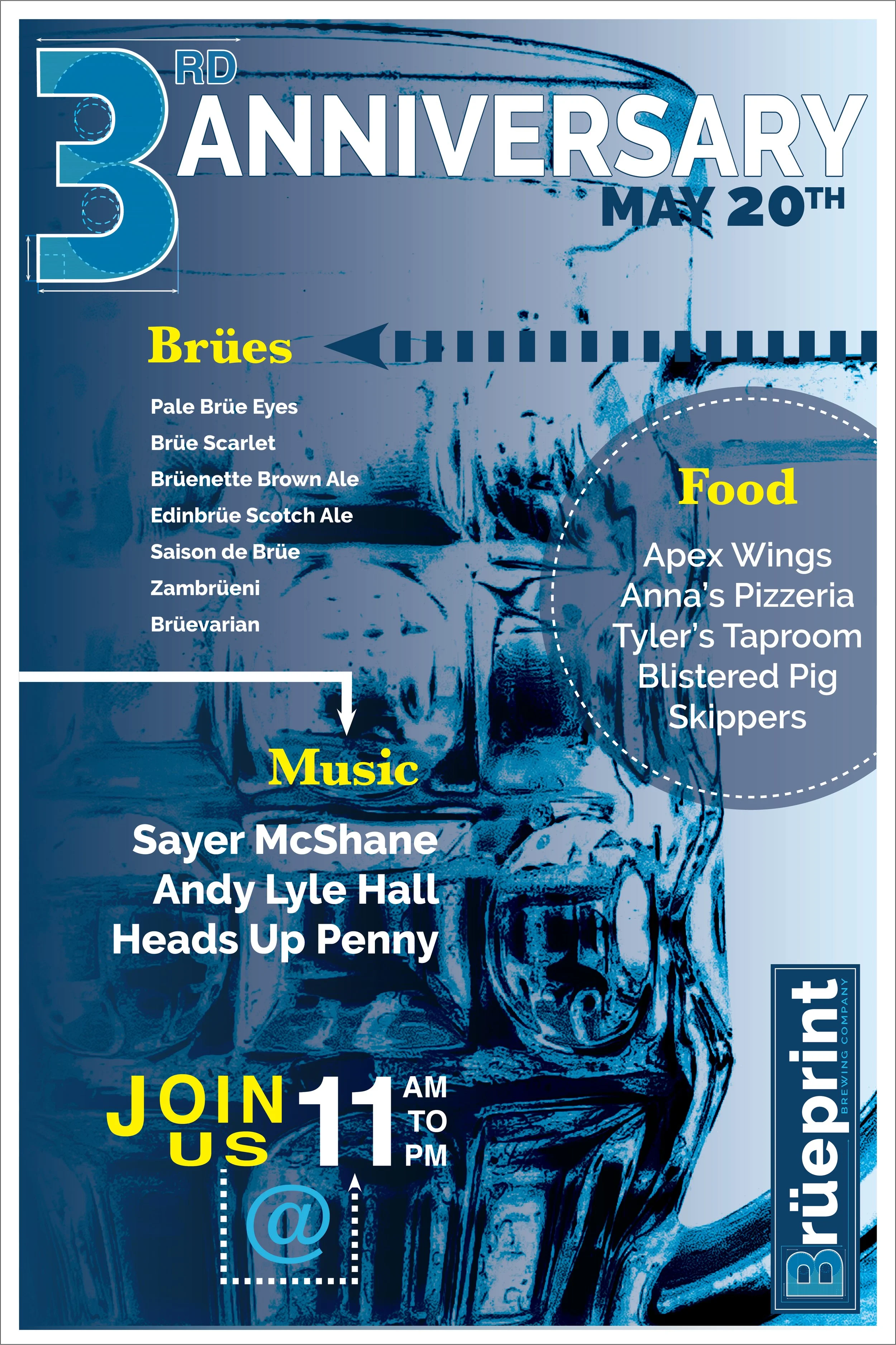 Promotional material was created for Brüeprint Brewery’s third-anniversary gathering while freelancing. A flyer that gets the point across by highlighting everything the event will showcase.