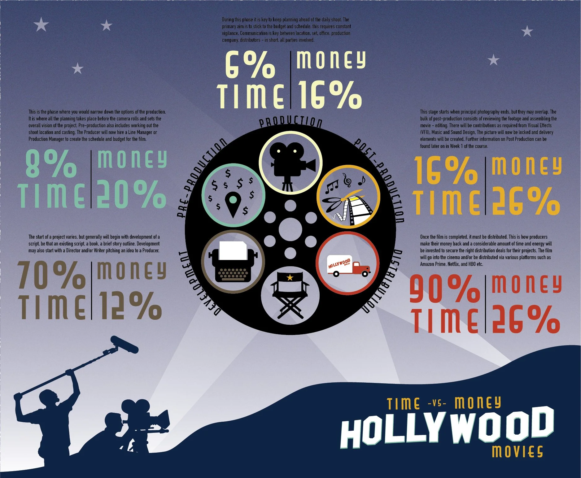 The five stages of movie production for a typical Hollywood film sequence. A more specific look into the time spent on each of the fazes and the revenue it takes to complete a film.